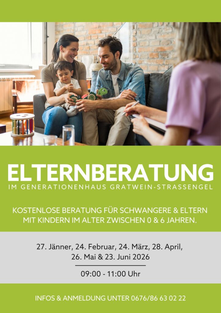 Einmal im Monat können Schwangere und Eltern mit Kindern im Alter zwischen 0 und 6 Jahren im Generationenhaus Gratwein-Straßengel kostenlose Beratung und fachkundige Auskunft zu allen Fragen über die Gesundheit, Pflege, Ernährung und Entwicklung des Kindes in Anspruch nehmen.