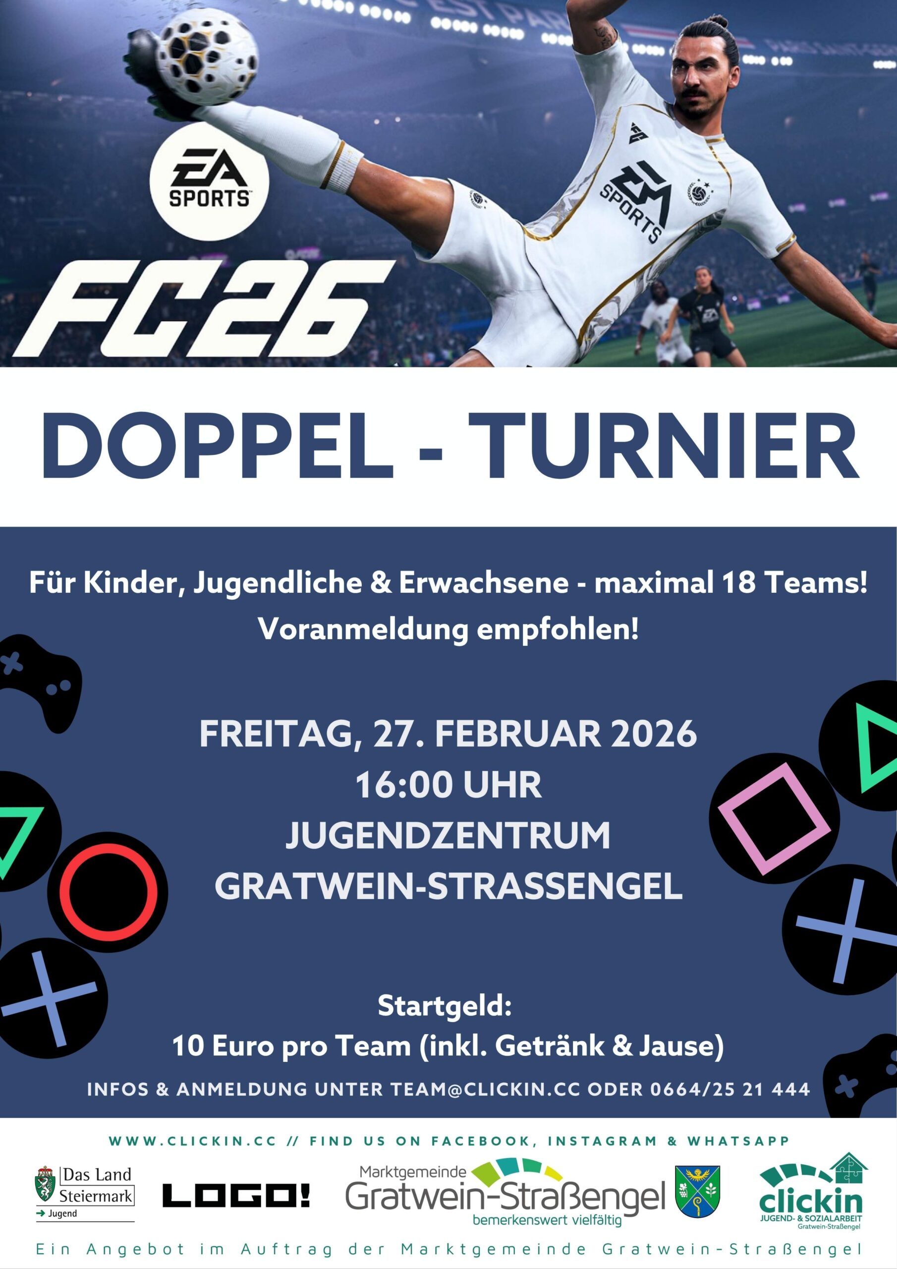 Wie jedes Jahr steht im Februar im Jugendzentrum das beliebte FC-Doppelturnier auf der PlayStation 5 am Programm. Gespielt wird FC26 mit bis zu 18 Teams, die zunächst in einer Gruppenphase und anschließend in KO-Duellen gegeneinander antreten. Auf die Sieger:innen warten wieder tolle Preise!