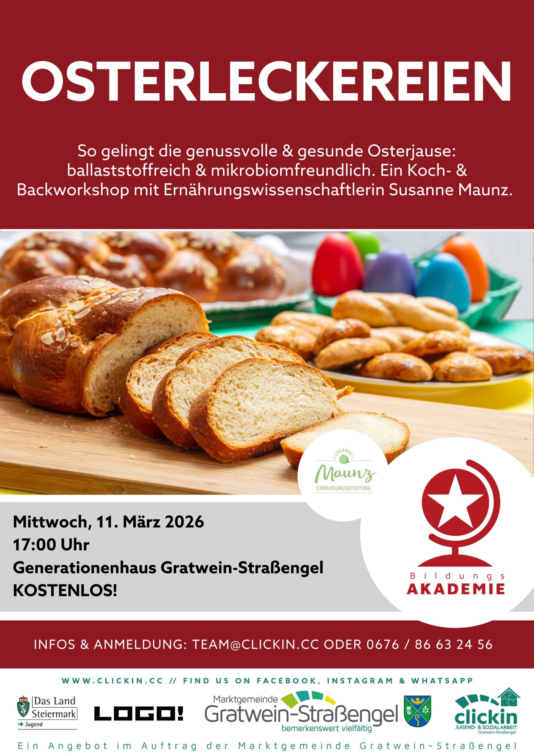 Parkzone Gratwein-Straßengel Grazer Straße 13, Gratwein-StraßengelUnter dem Namen „Kreativ im Park“ finden von November bis März verschiedene, kreative Angebote in der Parkzone im Park Straßengel statt. Das Programm im Februar: 07.02. - Lesezeichenatelier 21.02. - […]