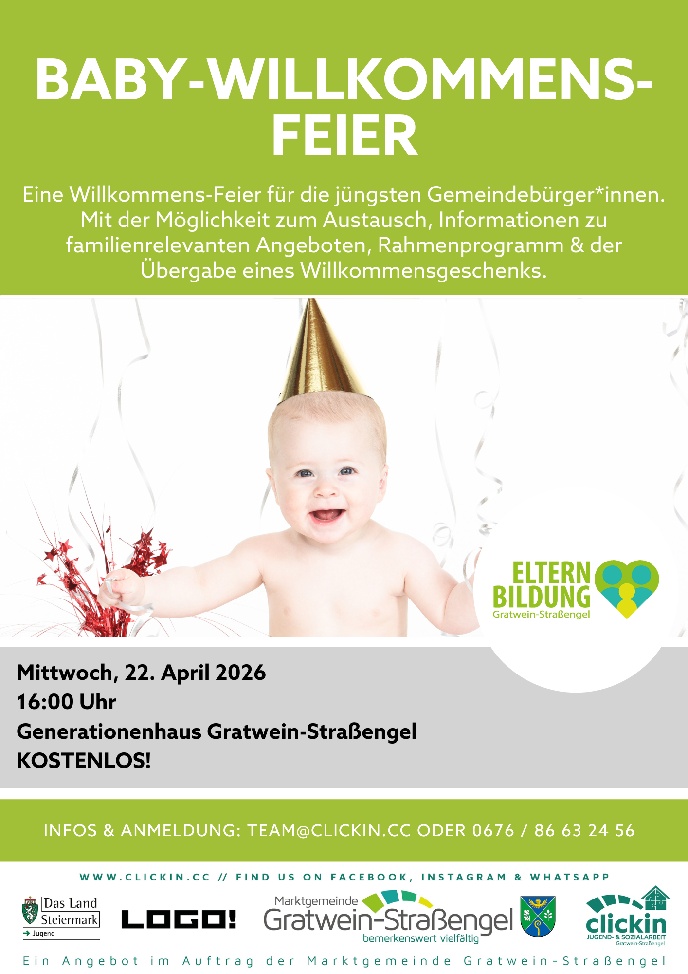 Am 22. April 2026 heißt die Marktgemeinde Gratwein-Straßengel wieder die jüngsten Gemeindebürger:innen willkommen. Im Generationenhaus gibt es die Möglichkeit zum Austausch, viele Informationen zu familienrelevanten Angeboten, ein buntes Rahmenprogramm sowie […]