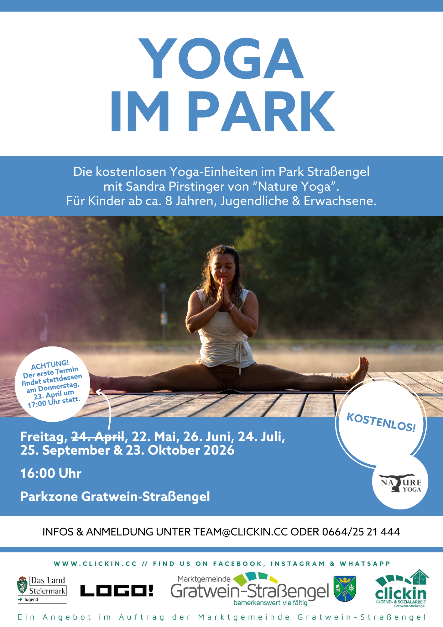 In der Parkzone Gratwein-Straßengel ergänzt „Nature Yoga“ das kostenlose Sport- und Bewegungsangebot um eine sanfte, achtsame Komponente. Über die Sommermonate lädt der Kurs einmal im Monat dazu ein, inmitten der Natur zur Ruhe zu kommen, den Körper zu stärken und neue Energie zu schöpfen.